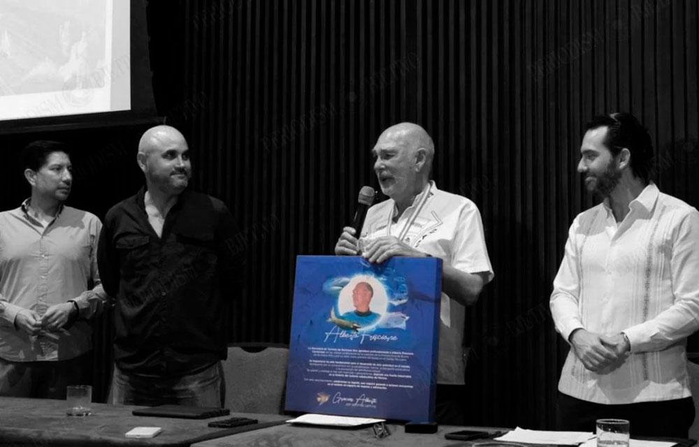La presentación de la GUÍA DE BUCEO DEL CARIBE MEXICANO fue el escaparate para rendir homenaje a RAMÓN BRAVO y ALBERTO FRISCIONE, cuyas aportaciones en la exploración, fotografía subacuática y buceo han contribuido de manera importante en la documentación e investigación del mundo marino de Quintana Roo.